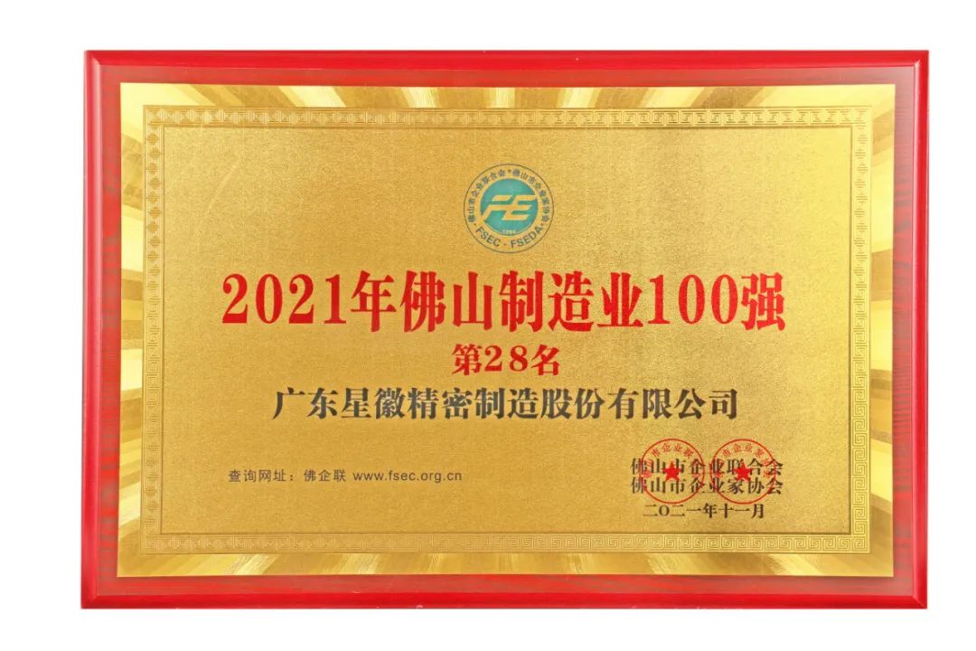 2021年11月20日,由佛山市企業(yè)聯(lián)合會(huì)、佛山市企業(yè)家協(xié)會(huì)主辦的2021年佛山市企業(yè)家活動(dòng)日暨佛山企業(yè)100強(qiáng)、制造業(yè)100強(qiáng)企業(yè)發(fā)布會(huì)順利舉行。會(huì)上發(fā)布了佛山雙百?gòu)?qiáng)榜單,憑借強(qiáng)勁的綜合實(shí)力和品牌影響力,星徽精密榮登“2021年佛山企業(yè)100強(qiáng)“第56名、“2021年佛山制造業(yè)100強(qiáng)”第28名,在家居五金企業(yè)中排名位列第一。