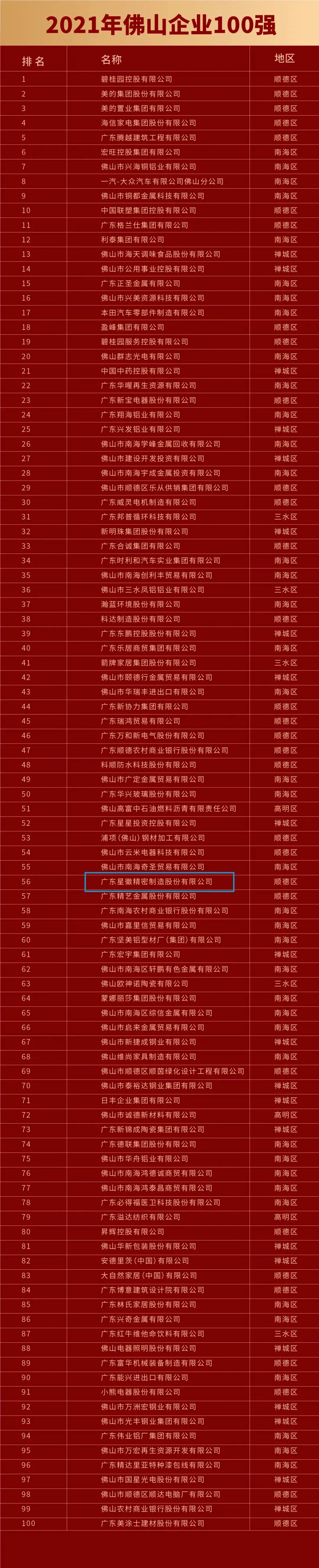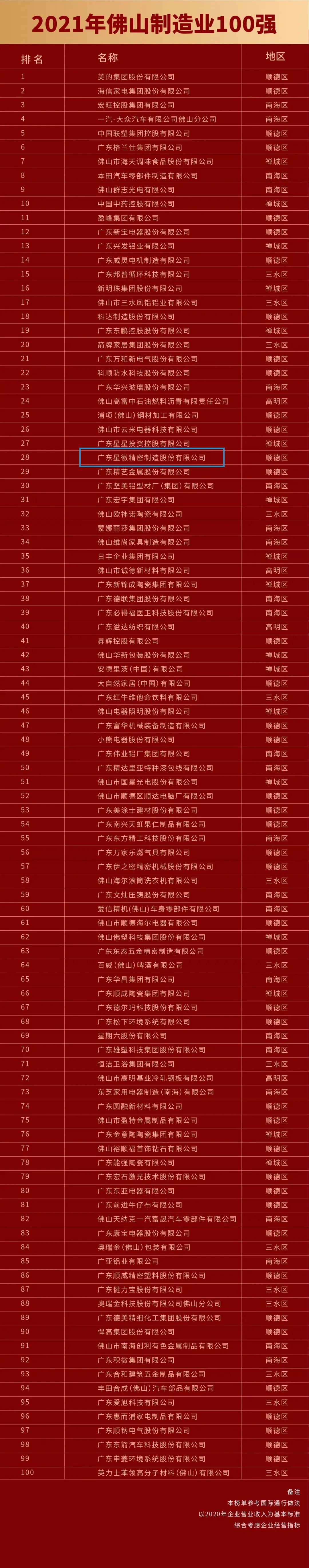 “佛山企業(yè)100強(qiáng)”榜單和“佛山制造業(yè)100強(qiáng)”榜單參照世界500強(qiáng)、中國(guó)企業(yè)500強(qiáng)、廣東企業(yè)500強(qiáng)等榜單的評(píng)選方式,評(píng)比過(guò)程權(quán)威、公正、公開,也得到了社會(huì)各界的高度認(rèn)可。相比較去年星徽精密今年排名上升23位,進(jìn)一步確立了星徽精密在行業(yè)中的領(lǐng)先地位。