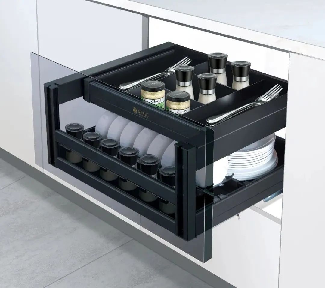 在廚房功能五金區(qū)域,星徽精密展出了全鋁星耀系列產(chǎn)品,簡約的設(shè)計加上采用全鋁與鋼化玻璃的組合,精細的做工,盡顯全鋁拉籃的輕奢高級。